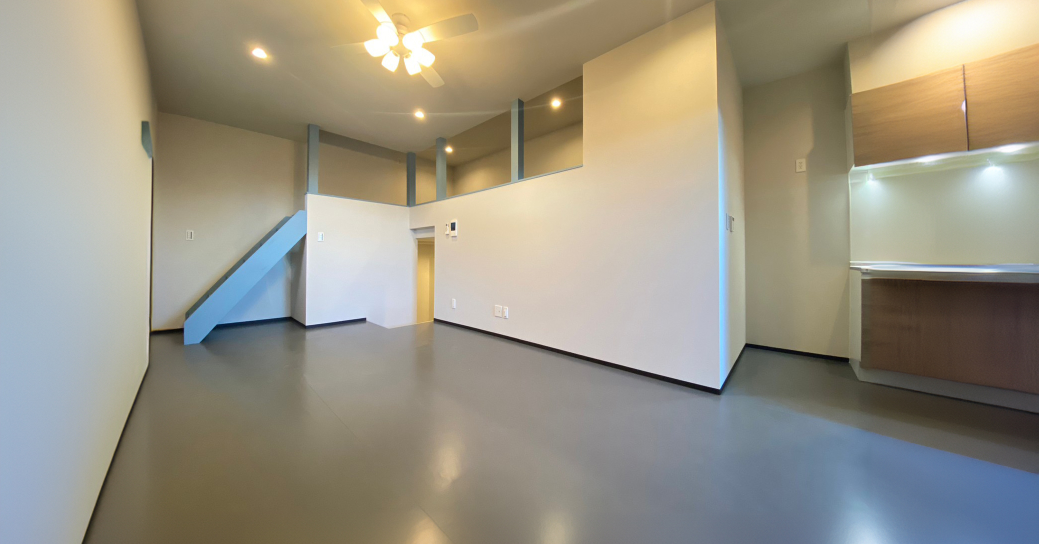 美術館やギャラリーなどの展示空間に理想とされる「ホワイト・キューブ(天井、壁、床まで白い空間)」の考え方を採り入れた室内デザイン。