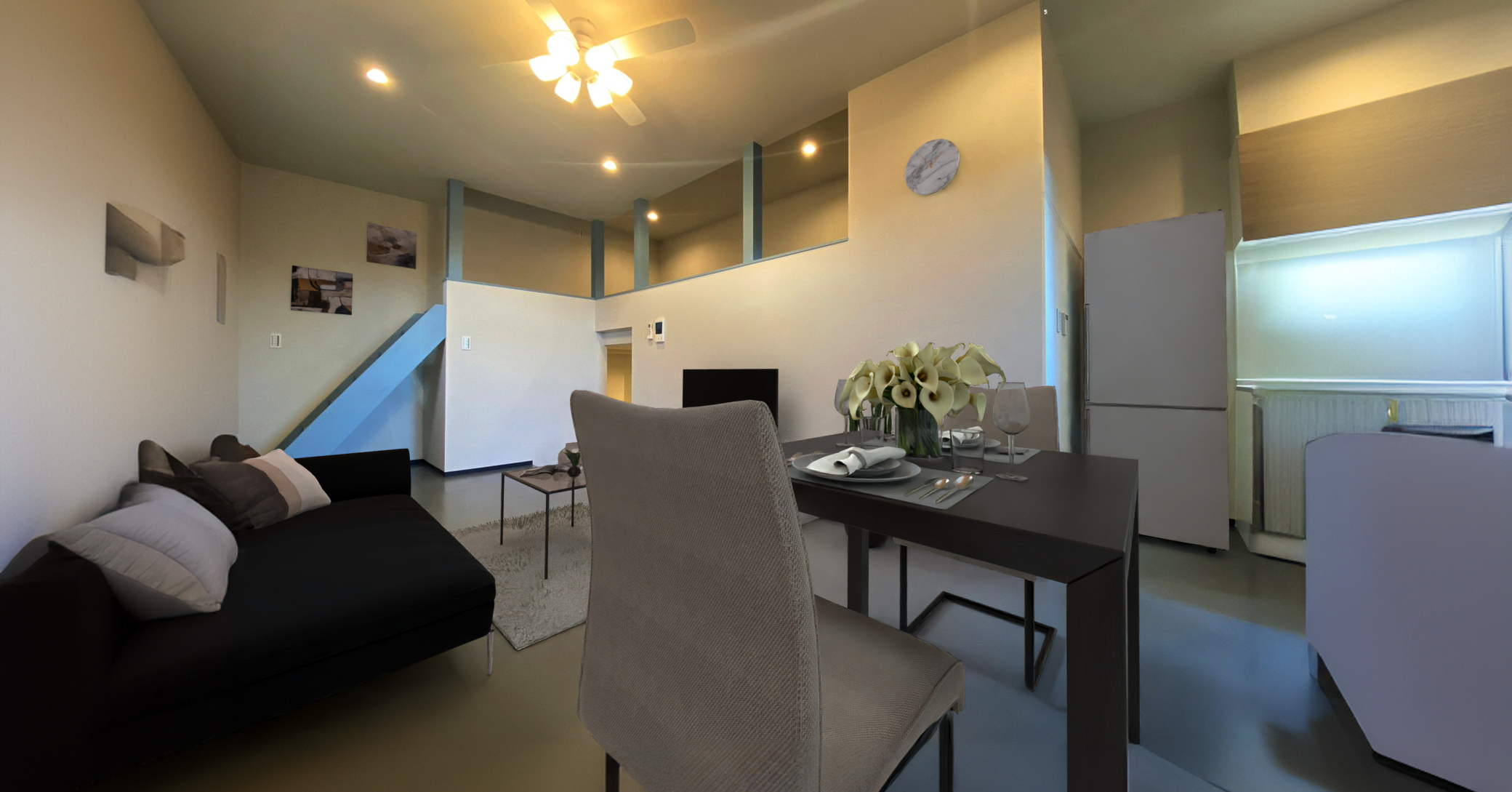 美術館やギャラリーなどの展示空間に理想とされる「ホワイト・キューブ(天井、壁、床まで白い空間)」の考え方を採り入れた室内デザイン。